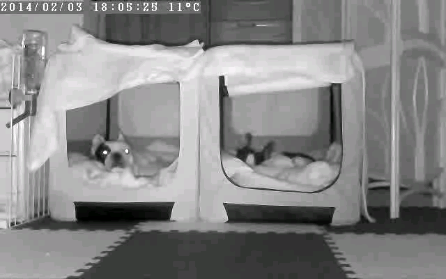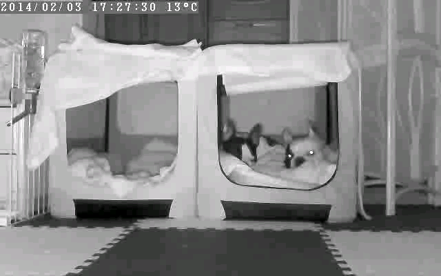 留守番カメラ 日常のこと 2014年02月04日 comment(2) http://j24h.blog.shinobi.jp/Entry/1040/留守番カメラ 恒例の?留守番カメラ。夕方になると何故か2ブヒ一緒にクレートに入っている。 因みに、入っているのはふうさんのクレート。だいたい大左エ門がお邪魔をしている。しかし、ふうさんはあまり一緒にいたくないらしく、しばらくすると大左エ門のクレートにお引越し。 このネットワークカメラ、夕方になっても暗視カメラになってよく見える。しかも180度カメラの向きを遠隔で動かせるし、こっちからカメラを通してぶひたちに呼びかけることもできる。大左エ門なんかキョロっキョロっと飼い主の姿を探してる様子が見えておもしろい。(ネットワークカメラなので、リアル動画で見ることができるのじゃ!)スマホのアプリで操作できるので、ほんとスゴイよね~。 【ランキング参加中】お気に召したらバナーをクリックしてくださいね。