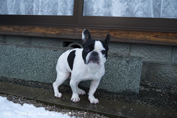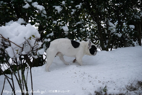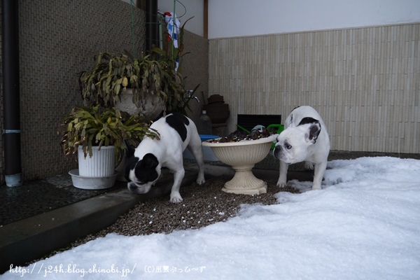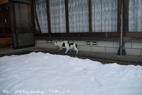 雪の中 日常のこと 2013年12月28日 comment(1) http://j24h.blog.shinobi.jp/Entry/1028/雪の中 今日から年末のお休みに突入した摩耶です。こんにちわ。いよいよ今年も残り少なくなってきました。今日は、朝から真っ白な庭を拝見しまして、まぁ見ただけで寒さ倍増。やる気というものがすべて消失しました。がぶひを庭に投入! 真っ白な雪にとまどう、軒下オトコたち。軒下ばかりを選んで、しばらく右往左往していました。 それにしても10センチくらいは積もったでしょうか?出雲より松江は、もっと積もったらしいですね。 まだ決心がつかないぶっひ~ず。それでもしばらくして、意を決して先に白い世界に飛び込んだのは、寒さが大嫌いな大左エ門のほうでした。 おかやん!ワタクスこんなに頑張りましたので、もういいでしょうか?@大左エ門ちょっとだけ雪の中を走り回った大左エ門ですが、まぁさっさと軒下オトコに戻りました。 早く帰りたいオーラ発動中!そんな大左エ門のことは、まったく無視して一度外に出たら帰りたがらないのが、こちら。 すみませんが、ふうさん、もうそろそろ帰っていただけないでしょうか?雪の中を平気で歩いているように写真では見えるふうさんも実際は、木の下の雪のほとんど積もっていない所を選んでスンスンしていました。見かけ倒しです。ぶっひ~ずを部屋に帰したあと、私は玄関前の雪かきを頑張りました!庭に出る前は「あ~雪だから庭が気にならなくていいわ~。庭掃除しなくてもすむし・・・」なんて浅はかなことを考えていましたが、ぶっひ~ずと庭に出てから「・・・・雪かきせんといけんがね・・・」と、自分の考えの甘さにがっかりでした。さて、部屋に戻ったぶっひ~ず。やっぱりヒーター前かっ! 【ランキング参加中】お気に召したらバナーをクリックしてくださいね。