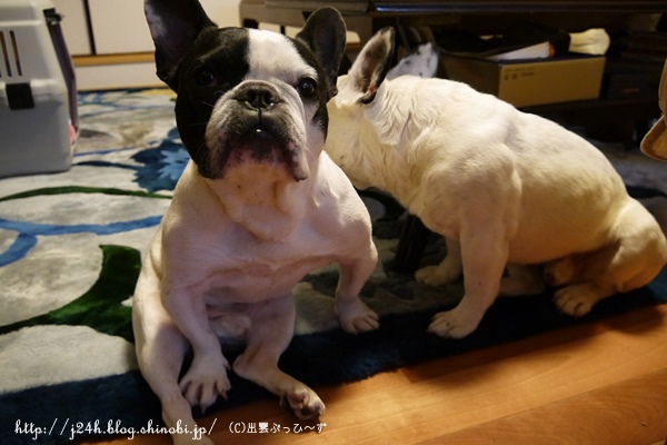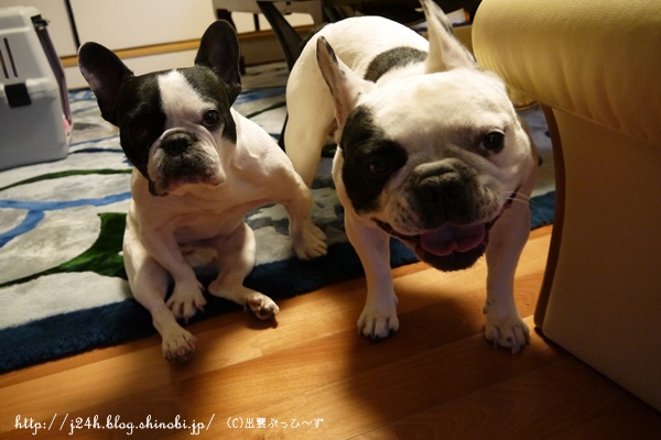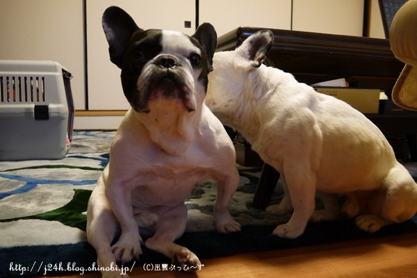 カメラ嫌い 日常のこと 2013年12月22日 comment(0) http://j24h.blog.shinobi.jp/Entry/1026/カメラ嫌い 先週、義母の35日法事が終わりホっとしました。この3連休は久しぶりに普通の休日っぽいです(ぽいって?)。庭掃除もお天気が悪いので、ちょこっとしかしなくていいし(笑)とはいえ、まだまだ後片付けが山盛りです。いわゆる遺品整理の類です。寒いのでなかなか手を付ける気にもならないのですが、もう使わなくなったもので家の中が溢れているので、スッキリ片付けて、2階の生活から1階の生活に切り替えたいです。ただ、1階となるとぶひたちの居場所をどこにするか悩みどころなんですよ。広い家なのに適当な場所がないという。とりあえず1階居間のヒーター前に陣取っていますけどね~出雲ぶっひ~ず! 後姿ではなんなんで、前から写真を撮ろうと思ったのですが・・・・ とたんに、ふうさんは大左エ門の陰に隠れました。カメラが苦手なふうさん。 そんなに顔をそむけなくても魂は抜かれませんからぁ~っ。 緊張のあまりあくびをするふうさん。大左エ門は、じーっとガン見です。 【ランキング参加中】お気に召したらバナーをクリックしてくださいね。