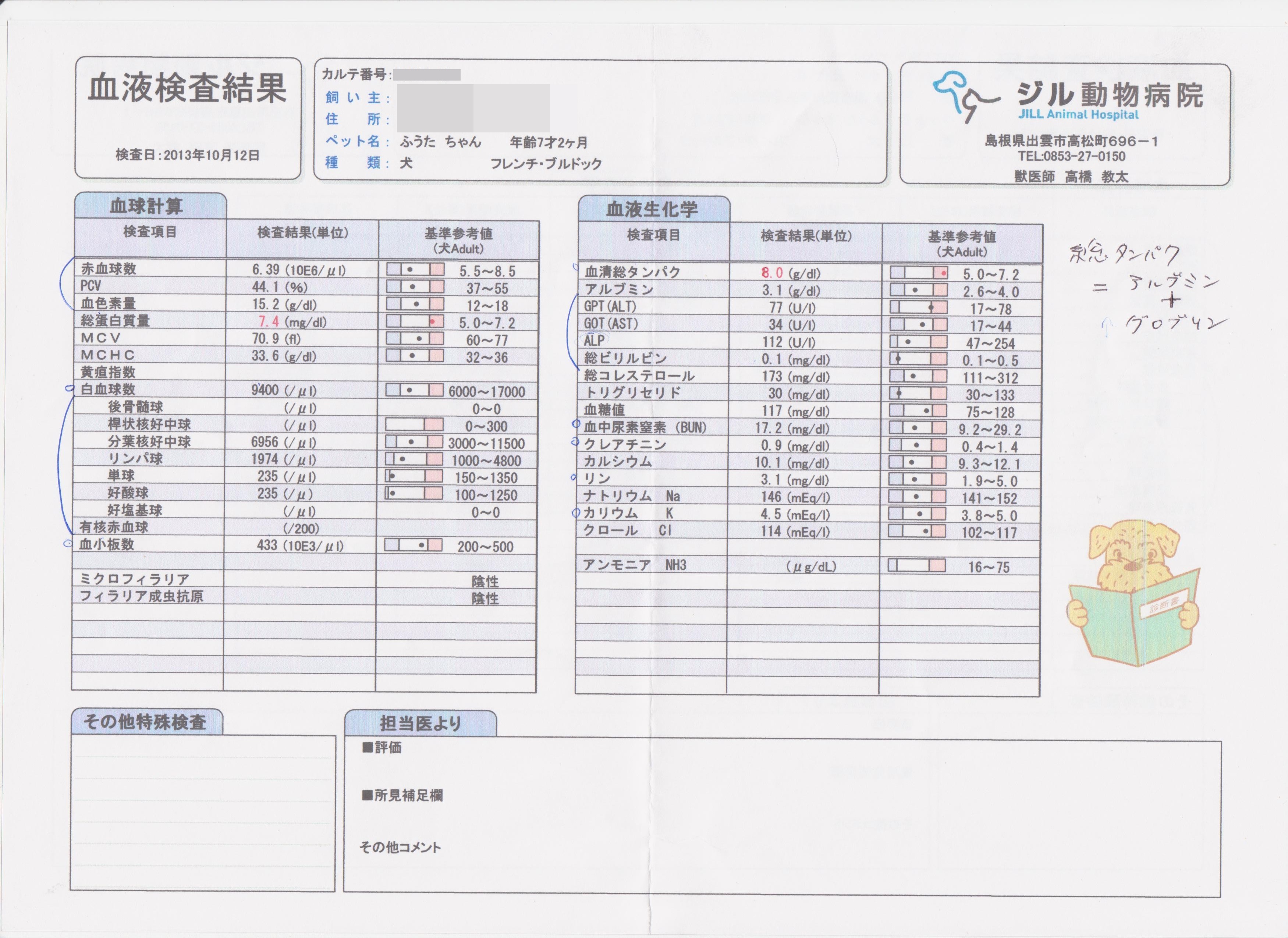 ふうさん健康診断を受ける 日常のこと 2013年10月13日 comment(2) http://j24h.blog.shinobi.jp/Entry/1019/ふうさん健康診断を受ける 今年の夏に7歳を迎えたふうさん。犬世界でいうところの「シニア世代」に突入しました。いたって元気なんだけど、時々ちょっとしたことが気になるお年頃です。先日も胃液を何度か吐いたのですが、そのときほんの針の先でつついた程度の点になった血が混じっていました。ハゲちゃんだって、もしかしたらホルモン異常かも?なんて心配も。それから耳!今年の夏は、えらく耳をかゆがり床にこすりつけたり頭をふったりといった行動が目立つようになりました。いろいろ気になることがあって、いつもの病院へ行こうかどうしようか迷っている中、先日大左エ門のアレルギーでお世話になった病院のHPをみたら「秋の健康診断キャンペーン」なるものをやっているとか。(単に血液検査が1000円引きってだけですが)朝食は抜いてきてね!ってことだったので、早々に朝ごはんを抜いて昨日の朝イチバンで健康診断に行ってきました。そして今朝、結果を聞きに病院へ。検査結果です。(クリックすると大きな画像で見られます) 特に問題となるところはありませんでした。貧血もなく炎症を起こしている数値も見られず、腎臓肝臓もOK!唯一タンパクが赤文字でしたが、総タンパクはアルブミン+グロブリンの数値で見るものだそうで、アルブミンはOKなのでグロブリン(検査結果には項目ナシ)が少し高くなっているのだろうという所見でした。年をとってくると数値が上がってくるものだそうです。免疫の関係らしい。そういやグロブリンって「免疫グロブリン」って言葉、聞いたことありますね。またゆっくり調べたいと思います。ということで、免疫UPのサプリをさがすことにします。やっぱり昨年、飲ませていたハタケシメジをもう一度、飲ませてみようかな~。これで病気のすべてがわかるわけではないけど、何に注意をしたらいいのか参考になるので、これから年に一回、健康診断を受けさせたいと思います。大左エ門も来年あたりから受けさせようかな。 【ランキング参加中】お気に召したらバナーをクリックしてくださいね。