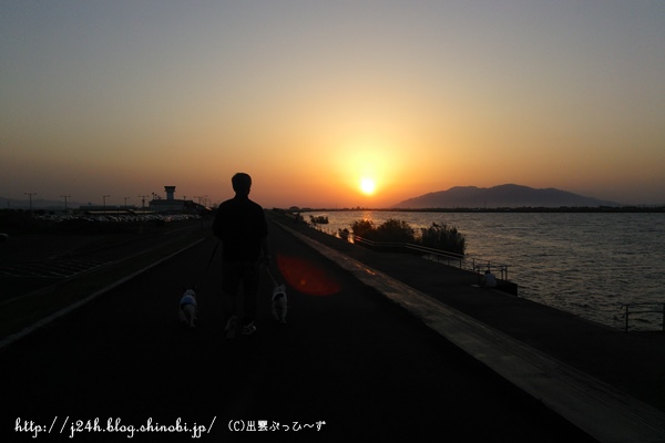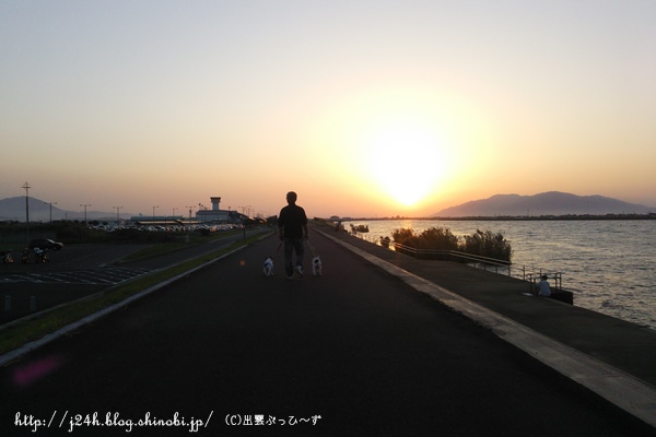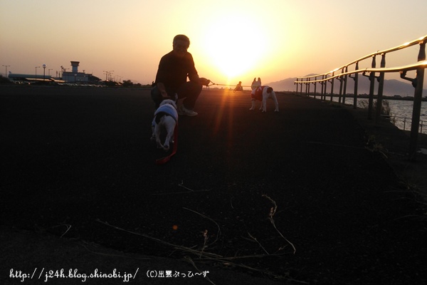 空港公園の夕日 日常のこと 2013年10月16日 comment(1) http://j24h.blog.shinobi.jp/Entry/1020/空港公園の夕日 先日の三連休の最終日。久しぶりに夕方のお散歩に出雲空港公園まで行ってきました。とりあえずは、すんすんタイムから。 ふうさん、ホリホリはヤメテくださいませんか・・・。あとでそのきちゃない手のまま車に乗るんですよ・・・ささ、さっさと砂浜のほうへ行きましょう。 滑走路沿いから宍道湖側へ移動してきました。 しゅみません、ワタクスどーしたらいいんでしょうか?こんな砂漠の真ん中で・・・@大左エ門いやいやどうぞお好きなように、大左エ門さんそれに砂漠じゃないしね ふうさん、何かをロックオン?あなたがロックオンするとロクなことありませんはい。退散退散。 そうこうしているうちに、宍道湖の西に夕日が沈んでいきます。秋の夕日って、とっても綺麗!! 私は、毎日、通勤も宍道湖沿いを車で走るので、夕日のきれいな日は、つくづくここに住んでて良かったな~と思います。夕暮に観光客の人も宍道湖の夕日を眺めにホテルから出てきています。カメラ好きな人もチラホラと三脚をたてて、シャッターを切っています。 夕日に向かって歩くおとやんとぶっひ~ずでした。 【ランキング参加中】お気に召したらバナーをクリックしてくださいね。
