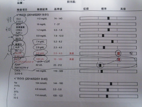 健康診断パート2 ふうのこと 2014年02月02日 comment(1) http://j24h.blog.shinobi.jp/Entry/1039/健康診断パート2 ふうさん、昨日かかりつけの病院で健康診断を受けてまいりました。昨年10月に別の病院で血液検査を受けたときから4ケ月弱の間に体重が1キロぐらい減っております。特に食べる量が減らしているとかではないはずなんですが・・・。それが気になる~ということで、今回かかりつけでも健康診断をしてもらうことになりました。結果は・・・・とりあえず重大な問題はみつかりませんでした。 ただ、10月もだったのですが、やっぱりグロブリンの値が標準より高い。高いといってもほんのわずか高いだけなので、今のところ問題になる数値ではないとのこと。今回、もうひとつ数値が高く出たのがALT(GPT)。肝疾患の数値ですね。ただ、これももしかしたら翌日計ったら基準値内かもしれないからということで、とりあえず経過観察。今回は、血液検査のほかにエコー検査もしてくれました。やるときは、やってくれる、かかりつけの獣医・・・・(笑)いつもは、気になることがあっても検査らしい検査はしてくれないなぁと不満に思うときがあるけどね。エコーは、膀胱、胆嚢、脾臓。膀胱、前立腺あたりは問題なし。脾臓も問題なし。ところが、胆嚢はわずかに胆泥が溜まっていました。もっともこれも今のところ治療の必要なしとのこと。ALTが高かったりグロブリンも基準値ギリギリでウロウロしてたりするので、なんにしても肝臓に注意してやる必要がありそうです。とりあえずは食事なんだけど・・・・。もう少し勉強が必要です。それにしてもなんで体重が減ってるのかは結局、わかりません。特に大きな問題がなかったので。食欲不振で体重減少ならどっか悪いとこでもあるかな?と思うけど、食欲ありありだし元気もありありだからなぁ。 でも今回、かかりつけの獣医さんで検査してもらって経過観察な点を把握してもらったのでそれは良かったなと。しかし、今までふうさんは3つの病院で血液検査をしてもらったけど、どこも微妙に検査結果表の項目が違うんですよねぇ。一番、細かかったのが去年の10月に受けたとこかな。しかも測定方法がどの病院も違うのか微妙に基準値が違うんですよねぇ。素人にはよくわかりません。とりあえず、ここんとこデトックスがおろそかだったように思うので、デトックスを考えます。またデトックスハーブティでも買おうかなー。てか、自分のデトックスも考えたほうがいいと思う(汗 PR 【ランキング参加中】お気に召したらバナーをクリックしてくださいね。