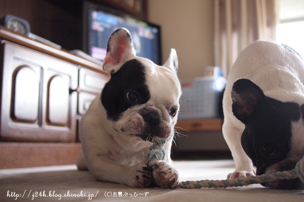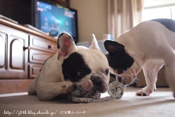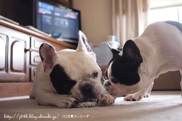 遊び 日常のこと 2013年09月20日 comment(0) http://j24h.blog.shinobi.jp/Entry/1015/遊び ふうさんのハゲちゃんも薬のおかげか落ち着いてきて、毛が生えるのを待つばかりな今日この頃。週に3~4回シャンプーしたときもあったので、水道代がどんだけ~って心配していましたが、いつもより1,000円ぐらいUPでおさまりホッとしています。脚のほうが、まだ怪しげなところがあるので、この連休は、またシャンプーしたいと思っています。さて~。今週は、私が夏休みだったこともあり散歩も十分できたと思います。そのせいかふうさんも夜ぐっすり寝ています。やっぱり散歩は大事だね。なまけているとふうさんがヤンチャになります。なので、ロープ遊びをしてみるのですが・・・・。くわえたら離しません(笑)飼い主的に↑ロープをかじっているふうさんの「ぷぅ~」っとした顔が好きです。 大左エ門も一応、狙っているんですけど・・・。 とうぜんふうさんから物を奪うなんて簡単なことではありません。 ケンカにならないうちにあきらめる大左エ門。それでヨシ。まったくロープ遊びにもならないのが現実ぅ。 PR 【ランキング参加中】お気に召したらバナーをクリックしてくださいね。