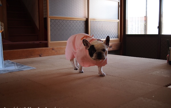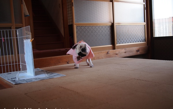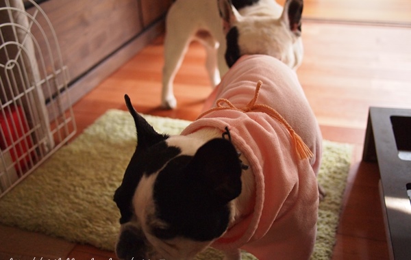 シャンプー後 日常のこと 2014年04月20日 comment(1) http://j24h.blog.shinobi.jp/Entry/1050/シャンプー後 今日は、午前中肌寒いと思っていたら午後からはお日様照ってぬくぬく~。そんな中お散歩に出かけたので、2ぶひともハァハァになりました。ボチボチ、クールネックも準備して散歩しないといけない時期に突入ですね。お散歩のあと2ぶひをシャンプーしました。このところ抜毛が多いふうさん。毛艶もよくなって、くすんでいた毛も白さが戻ってきています。もしかして今年の夏は、ハゲずにいけるのでは?と密かに期待しております。シャンプー後、なぜかいつもしばらくの間、暴れるふうさん。よほど身体がぬれているのがイヤなのでしょうか? スーパーぶるぶるを披露。 そして部屋中あちこち放浪しては、壁際を身体をこすりつけるように歩いてさまよいます。そして大左エ門。 着ているバスローブは、某ホームセンターで購入したものですが、正直言ってイマイチな作りでした。歩いているとだんだんズレてきて、前足で踏んづけてしまい危ないんです。なので、適当に家にあった紐で縛っていますが、もう少しよさげなバスローブがないものでしょうか?ふうさん、まだ大左エ門のお尻の匂いを嗅いでますが、シャンプーしても大左エ門は臭いですか?最近、大左エ門の脇腹のあたりをペロっと舐めていたりするふうさんです。なんか、いやらしい中年おやじっぽいです。確かにそんな年齢になったふうさんですが・・・。大左エ門がそんなに美味しいとは思えないんだけどねぇ。しかたがないので、シャンプー後、大左エ門のお尻周辺にはまたもやラベンダーのエッセンシャルオイルをつけておきました。これで一日ぐらいは、ふうさんを大左エ門から追い払うことができます。エッセンシャルオイルはふうさん避けに効果を発揮中~! PR 【ランキング参加中】お気に召したらバナーをクリックしてくださいね。