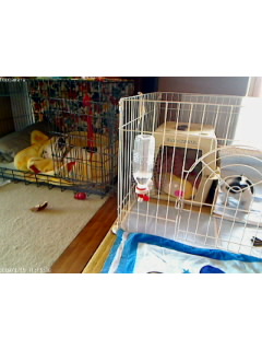 留守番画像の巻き 日常のこと 2008年04月25日 comment(4) http://j24h.blog.shinobi.jp/Entry/166/留守番画像の巻き 夕べケージの配置替えを実行した。ふた間続きの真中に並べてみました。 チビはともかく、ふうも自分のケージでお留守番できているようです。 相変わらずふうは二階でフリーですが、留守番は上手にしてくれますでも私たちがいるときは、チト粗相が増えたのが悩みどころです。 どうも留守番のときはどうせチビと遊べないのがわかっているけど、私たちがいるとチビを出してもらって、いつ遊べるか、いつ遊べるかと落ち着かなくなるらしい。今朝なんぞチビのサークルの中に向かって足をあげてシャーでした(涙) それにしても落ち着いて遊ぶことがない兄弟です。 PR 【ランキング参加中】お気に召したらバナーをクリックしてくださいね。