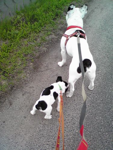お散歩でぶ~の巻き 日常のこと 2008年06月03日 comment(7) http://j24h.blog.shinobi.jp/Entry/191/お散歩でぶ~の巻き 大左エ門2回目のワクチンも何事もなく終わり、1週間がたった。いよいよお散歩でぶ~であーる。ふうたれがいるおかげか、外に出るのを嫌がることもなく、ふうたれの後を追いかけて歩く大左エ門。 もちろん2回ぐらいは、家の庭先で予行練習をした。そのときは、さすがに怖がっている様子で、動こうとしなかったりした。あとはキャリーバッグに入れて、ふうの散歩に2度ほど連れて出た。そして先週の土曜日に、初めてふうと一緒に家の外にお散歩でぶ~!なんのことはない。ふうたれのあとを追いかけて歩く歩く。お外なんて全然ヘーキ。散歩のときはバトルもない。平和であーる。やっぱり犬は犬同士のもんだね。 PR 【ランキング参加中】お気に召したらバナーをクリックしてくださいね。