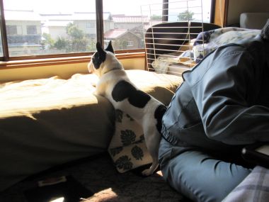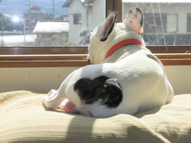 弥生3月桃の節句に誕生日 日常のこと 2009年03月06日 comment(2) http://j24h.blog.shinobi.jp/Entry/358/弥生3月桃の節句に誕生日 ・・・とある日の朝のふうたれ。毎朝、大左エ門をサークルから出した後、なぜかしらふうたれは必ず大左エ門のクレートを確認に行く。入念にクレートの中の匂いをチェックしたあとサークルから出てくるのだが、この日は、なにを思ったか自分がクレートの中に入って、そのまま収まってしまった。居酒屋ブヒの大将としてはでつねー。時々、店の中を点検しなきゃーならんのでつよぉふうが入ると、かなりきゅうくつそうに見える。 ところで2009年ももう3月なわけですよね。なかなかお天気がいい日が少ないですが・・・我が寝室は、南に面した大きな窓があるためお天気がいい日は、ぬくいのです。窓辺にはソファーが置いてあります。カバーをめくると、そこにはふうたれがソファーをほじくって中の綿を引っ張り出した穴っぽこが沢山あります(涙)それはともかく、ふうたれは、これからの季節、このソファーで外を見ながらひなたぼっこしてウトウトするのが好きです。一方、大左エ門には、ソファーの上やら高いところに上がったらイケナイと教えたので、上がれる力はあるのだけど、一応、私たちが見ているのでソファーの上にはあがりません。どこかで先住権の特権というものは守ってやらねばと思っています。追伸:3月3日で、しじゅーごさいになりました。誰がって、あたしがぁー。 PR 【ランキング参加中】お気に召したらバナーをクリックしてくださいね。