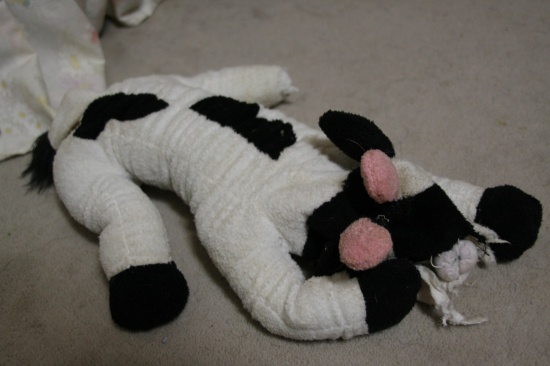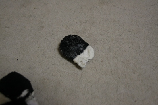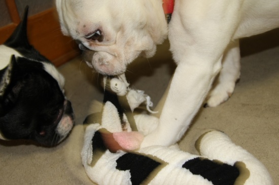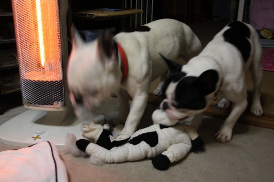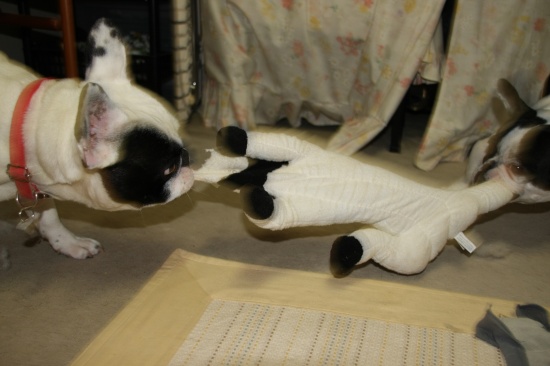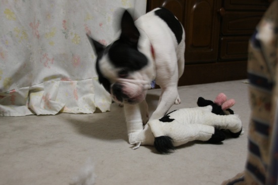 ストレス解消 日常のこと 2009年12月07日 comment(4) http://j24h.blog.shinobi.jp/Entry/486/ストレス解消 ぬいぐるみ系のおもちゃは、すぐ崩壊する。この日、以前、買っていたパイドのモーモーちゃんの入ったカゴを出していたら、ふうたれが、モーモーちゃんと遊びたいと申し出たので、カゴからモーモーちゃんを出してやった。すでに、無残な姿になりつつあったモーモーちゃんだったが・・・ さらに食いちぎられていくモーモーちゃん。兄ちゃん、なにしてるでつか?大左エ門も興味シンシンワタクシも協力いたしますでつよ。この足のあたりが、うまいでございまつよ。兄ちゃん、このモーモーの野郎をワタクスにくだつぁい!こーつてやるでございまつ。・・・・あんたたち・・・・って、残酷・・・こうして、モーモーちゃんの足の先が、とれた。とれた、というより大左エ門に食いちぎられたのだった。最初、何かを飲み込もうとしていたのがわかったので、あわてて、ノドの奥に手を突っ込んでみたら、出てきたのが、コレだった。オマエは、ほんとーに、オバカで困る。(以前には、ロープを、ほぐすだけほぐして、糸状になったものを沢山飲み込んだ挙句、吐き出した・・)そしてモーモーちゃんは、2ブヒのストレス解消の役目を果たし、その生涯を終えたのだった。 PR 【ランキング参加中】お気に召したらバナーをクリックしてくださいね。