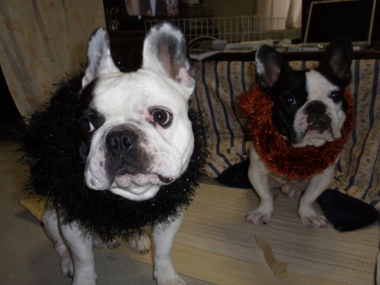 今の流行の巻き 日常のこと 2009年12月22日 comment(6) http://j24h.blog.shinobi.jp/Entry/490/今の流行の巻き 最近ネックウォーマーが流行っているらしい・・・というので、さっそく我が家も。ライオン丸になってもらった。おいしそうにホネしゃぶってるし。というか、コレ本当は、かーちゃんのマフラー。ちょっとラメなんか入っててキラキラしてる。 ついでに、こっちも。マダ~ムトレビア~ンな感じぃ~♪雪はふるぅ~ぅぅぅぅ あなたは こないぃぃぃ~ ♪オラたち 「ブルドッグ フランセ」(内心:いささかメイワク)メイワクついでに、ふうたれちゃんは、もういっちょ。かなりノーマルなネックウォーマー。ホームセンターで買った安物。ネックウォーマーしてるとブヒも本当に温いんだろうか? PR 【ランキング参加中】お気に召したらバナーをクリックしてくださいね。