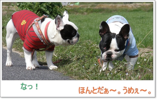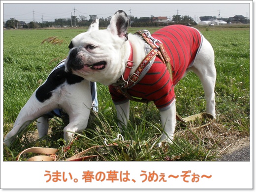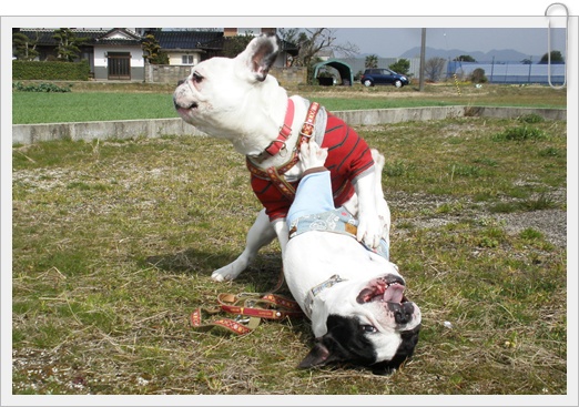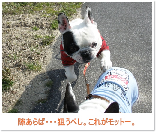 春の強風 日常のこと 2010年03月20日 comment(4) http://j24h.blog.shinobi.jp/Entry/524/春の強風 生あたたかい強風が吹き荒れた一日。ここのところ運動不足な2ブヒを連れて、1時間ばかり散歩へレッツラゴー。はりきって行きまつよぉ~!ほれ~~~~っ!近所の公文の庭で、2ブヒを解放すると、すぐさま大左エ門に襲い掛かるふうたれ。大左エ門くん、服がぬげそうです。ふうたれくん、大左エ門のマンネリ攻撃に慣れてしまったので、うまくカミカミ攻撃をかわすようになりました。大左エ門よ、他の技を考えよ。 いきなりバトルで、ゼーゼーハァーハァーの2ブヒになったので、適当にゴングをならして終了~!バトルのあとは、腹が減ったので、ちょっとおやつがわりに・・・ふうたれくん、春の草の試食中。大左エ門も続いて試食中。2ブヒが、試食しているあいだに、おかやんは、どんどん一本道を歩いて進む。何度か、大左エ門がダッシュしようとしたが、ふうやんが試食会場から動こうとしないので、さすがの大左エ門もふうたれを引きずって歩くことができず、座っておかやんの行方を追っていたが、そのうち、ふうたれも気が付いて、走り出した。おかやんに追いついて、ホッと一安心している隙を狙って、大左エ門の背後から攻撃をしかけようとするふうたれ。夜になったら雷と雨。明日は、散歩は無理かなぁ。。。。今夜は、さすがに疲れたらしい2ブヒ。早くも熟睡中です。 PR 【ランキング参加中】お気に召したらバナーをクリックしてくださいね。