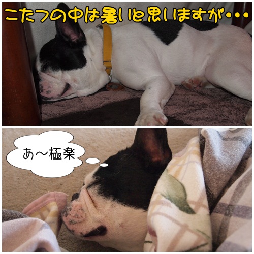 おこたでうたた寝 日常のこと 2011年02月23日 comment(2) http://j24h.blog.shinobi.jp/Entry/710/おこたでうたた寝 人間でもコタツでうたた寝って気持ちがよかったりしますが、ブヒたちもコタツ大好き!大左エ門は、完全にコタツにもぐりこみ、暑くなってハァハァ言いながらでも出てこないバカっぷりのため、顔だけ強制的に外へだしました。ふうは、大左エ門がコタツにもぐりこんでいるときは、神経使いながら自分のもぐりこめるスペースを確認して、だいたいおかやんの足の間に陣取ります。もぐりこめそうにないなーと思うと、おかやんの隣で、こうして寝てます。大左エ門のおけちゅを追いかける夢でも見ているのかもねぇ~。でもだんだん暖かくなってきたから、コタツにもぐりこむのも今しばらくの間だねぇ。 PR 【ランキング参加中】お気に召したらバナーをクリックしてくださいね。