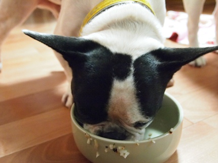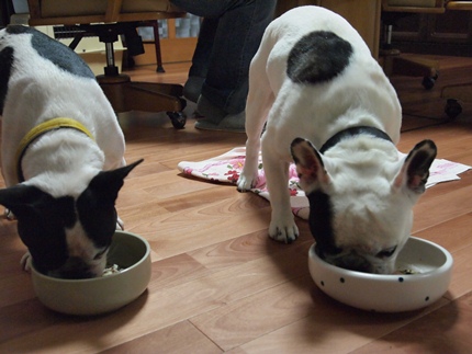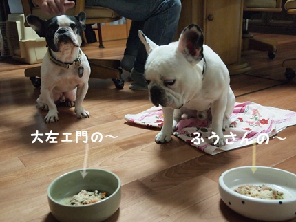 ご飯 日常のこと 2011年09月29日 comment(0) http://j24h.blog.shinobi.jp/Entry/811/ご飯 夜ごはんは、準手作り~(笑)なぜ準かというと、手作りベース食を利用するから。現在使用しているのはPOCHIさんの五目パララ。どんな商品かは、またの機会に~。待てです~。って、ふうさん、そっちは大左エ門のなんだけどね。もしかして独り占めしようって魂胆?!大左エ門は、いつ「ヨシ」の合図が出るのか必死で指示待ちです。聞き逃したらこの世の終わり!みたいな・・・ぐらいに必死です(笑)よ~し!トラブルもなくふうさんも自分のフードボールに向かいました。わかってるんじゃん!大左エ門、ご飯が沢山外側についてますよぉ。大左エ門のフードボールは、お水がおいしくなるという謎の器(笑)本当においしくなるんだろうか???私もオーナーアイテムでマグカップを買ったけど、よくわかんないです。ふうさんのフードボールは、ブルドスさんのフードボールです。ふうさんのデカ顔とデカ口には、このサイズのフードボールがよいです。ちゃんと床に落ちたのも掃除しま~す!大左エ門は、食い意地がはってるので、自分の器はモチロン、ふうさんの器もペカペカにキレイになめてくれます。ふうさんは、たま~にペカペカにキレイになめますが、通常は、ちょっとした粒は残したまま、食事もそこそこに大左エ門のおけちゅを匂いに行きます。食後には必ずなんですよねぇ。この行動はいったいなんなんだろう???? PR 【ランキング参加中】お気に召したらバナーをクリックしてくださいね。