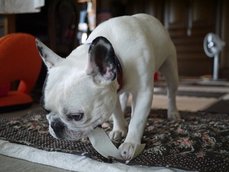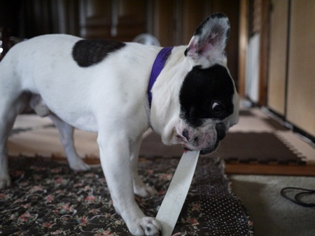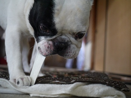 牛皮に燃えるオトコの巻き ふうのこと 2012年09月09日 comment(2) http://j24h.blog.shinobi.jp/Entry/911/牛皮に燃えるオトコの巻き いつもはマローンボーンというガジガジ棒でガジガジしていますが、これヒヅメと同じで固すぎるのが難点です。ふうさん、奥歯をヒヅメで折っちゃいました。多分、歯の治療に自信あるぞ~!という果敢な獣医さんは、即「抜いたほうがいいですよ」とおっしゃると思いますが、幸い(?)田舎の獣医さんは、そもそも歯の専門ではないこととフレブルにはできるだけ麻酔をかけたくないという方が多いらしく、どこへ行っても「今はほっておくのがベストでしょう」みたな言い方をされます。なので特にふうさん、歯周病には要注意!歯ブラシも買っていますが、ふうさん口をイーーーーーーーってしたままの歯磨きになるので、うまく磨けず、グリニーズも買っていますが、「ちょっと!もう少しガジガジして食べなさいよっ!」と毎回小言を言う始末(多少は噛んでるけど、ちょっと小さくなったら丸のみ~)なので久々に牛皮ガムを買いました。ちょっと変わったビロ~ンと薄くて長いタイプのガム。ふうさん格闘しております。因みに大左エ門は、見向きもしなかったため画像がありません(汗)ふうさん、牛皮のオモチャになると獣に変身するため途中で下手に手を出すと、本気でうなり怒ります。なので、普通のホネ型を与えると長時間それに没頭し途中で取り上げることができないので与えません。因みにコレ、ものの10分ぐらいで飲み込める状態になってしまいました。長さは切れないので変わらないんですが、柔らかくなってくると全部口に入ってしまうので、吐きそうになりながら飲み込んでしまいます。それはそれでちょっと困るな。でもいい感じでカミカミできてストレス発散にもなりそうです。しかし牛皮って中国産ばっかり?それだけが気になっています。そういえばインド産の牛耳もありました。豚耳は前から知っていましたが、牛耳もあるんですね。良く見たら短い黒い毛が生えていました。ハッハッハッ・・・。思わず笑って、手に取った商品を元に戻しましたとさ。 PR 【ランキング参加中】お気に召したらバナーをクリックしてくださいね。