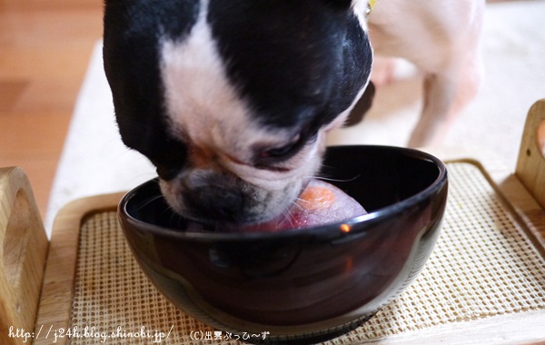 大左エ門チッコタレ5歳 大左エ門のこと 2013年02月18日 comment(4) http://j24h.blog.shinobi.jp/Entry/963/大左エ門チッコタレ5歳 本日めでたく元気に5歳を迎えた大左エ門ですが、ここ数日チッコ失敗3連ちゃん中で~す。チッコタレ5歳ばんざーい!いち早く前記事にお祝いコメントくださった方々、ありがとうございます。5歳になった誕生日の朝もチッコタレでした。それが何かぁ?@大左エ門そんな大左エ門ですが、今日はケーキでお祝いです。ドッグダイナー椀 白金さんのむらさきいもを使ったケーキです。犬用ケーキ 無添加 誕生日 犬 ケーキ 犬ケーキ プレゼント ギフト 誕生日ケーキ バースデーケー...価格:3,360円(税込、送料込)ショップのケーキは、上が透明で中の人参やフルーツが見えていますが、実際は↑こんな不透明でイマイチ見栄えが・・・(汗冷凍で届くのですが、朝、冷凍庫から出して室温で解凍してたんですけど、寒い時期なので透明にならなかったのかもしれません。もっともブヒたちにそんな見栄えは不要ですけどね~。このお店のケーキは、人間が食べることもできるので、ちょっとだけむらさきいものムースの部分を食べてみました。ほんのりと甘かったです。食うぞぉ~@大左エ門でーぜーもん、顔が怖い。あっという間に完食してしまいました。(隣で食べていたふうさんは、大左エ門と同量を与えていたのに、この時点でまだ半分ぐらい残っていた)食後のわんわん漢方いつもはごはんに混ぜますが今日は、単独でどうぞ。サイトのほうでも紹介しています。⇒犬の漢方サプリ我が家は先日、二袋目を注文しました。ふうさんのウンチがいい感じになるので、ちょいと続けてみようと思っています。今は、万田酵素きゃどっく(顆粒)も与えていますが、この漢方だけにしてもいいかな~と思いはじめています。なにしろコスパが漢方のほうがいいもんで(汗)でもビフィズス菌が増えるのは、きゃどっくのほうかな~と思うとなかなかこれも手放せません(汗)まぁケチって、目安の量より少なく与えてるので、2ブヒで2か月に1袋ぐらいしか買いませんが・・(おぃおぃ・・・だよ。このケチやろー)いやーホント、ブヒゲル係数高いな・・・我が家(涙 PR 【ランキング参加中】お気に召したらバナーをクリックしてくださいね。